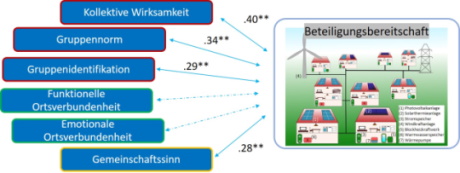 Abbildung 1 zeigt erste Ergebnisse der Befragung hinsichtlich potenzieller Prädiktoren der Beteiligungsbereitschaft an Energiegemeinschaften. Dargestellt sind hier psychologische Faktoren, die die lokale, gemeinschaftliche Ebene von Energiegemeinschaften aufgreifen, d.h. die soziale Identität (kollektive Wirksamkeit, Gruppennorm, Gruppenidentifikation), funktionelle und emotionale Ortsverbundenheit sowie der Gemeinschaftssinn. Deutlich wird der Zusammenhang zwischen der sozialen Identität und dem Gemeinschaftssinn mit der Bereitschaft sich zu beteiligen. Für die Ortsverbundenheit ergibt sich hier kein signifikanter Zusammenhang mit der Bereitschaft sich an einer Energiegemeinschaft zu beteiligen.